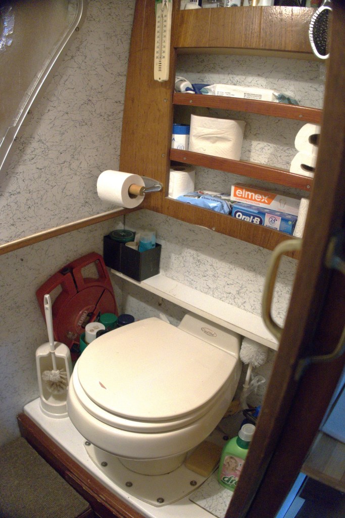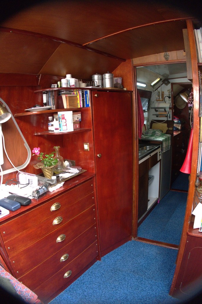 Cabine 1 / Room : Lit double 160×200, 1 salle d’eau, évier WC électrique douche, hauteur sous barrot 1.81 m