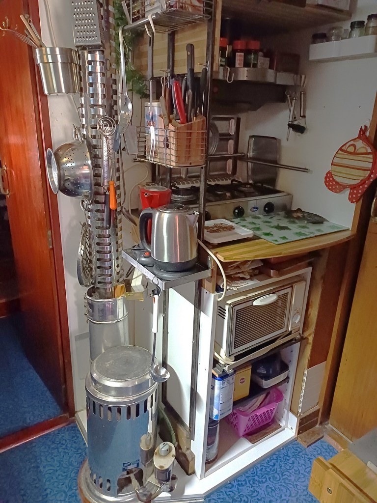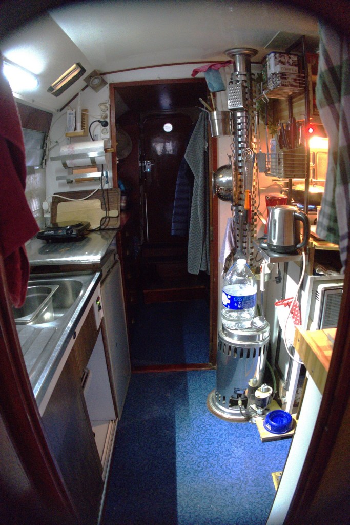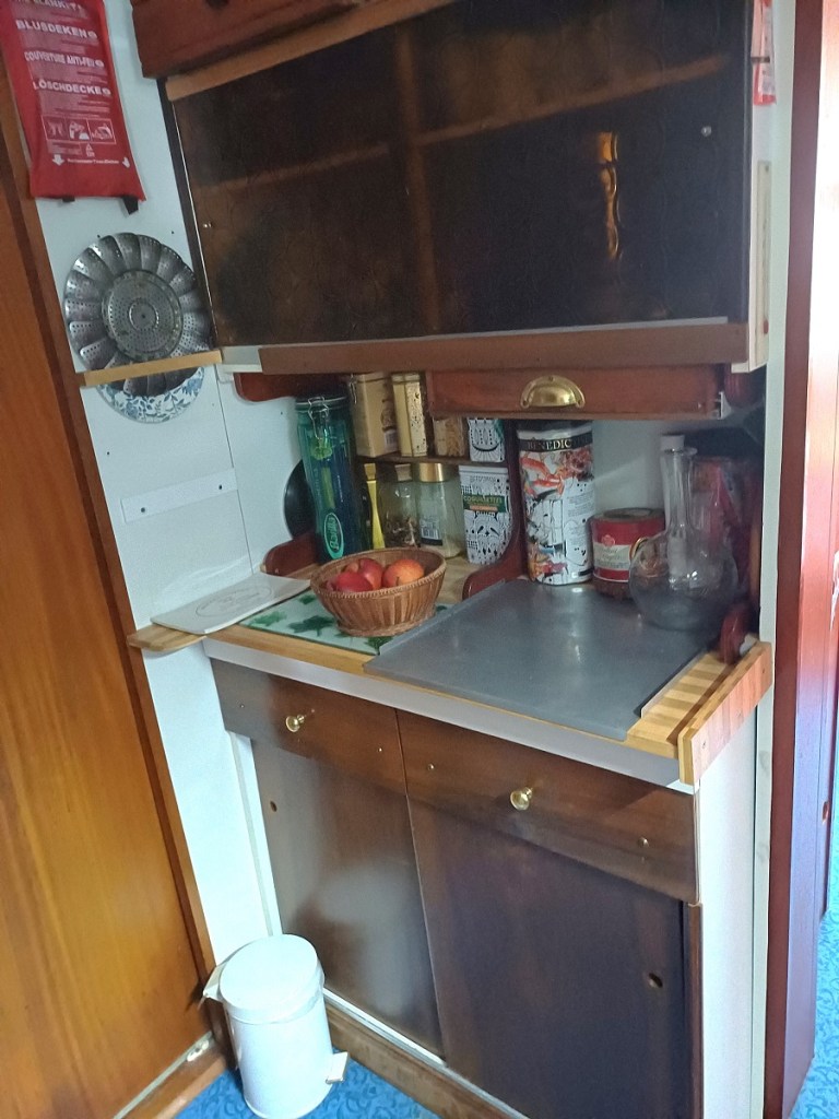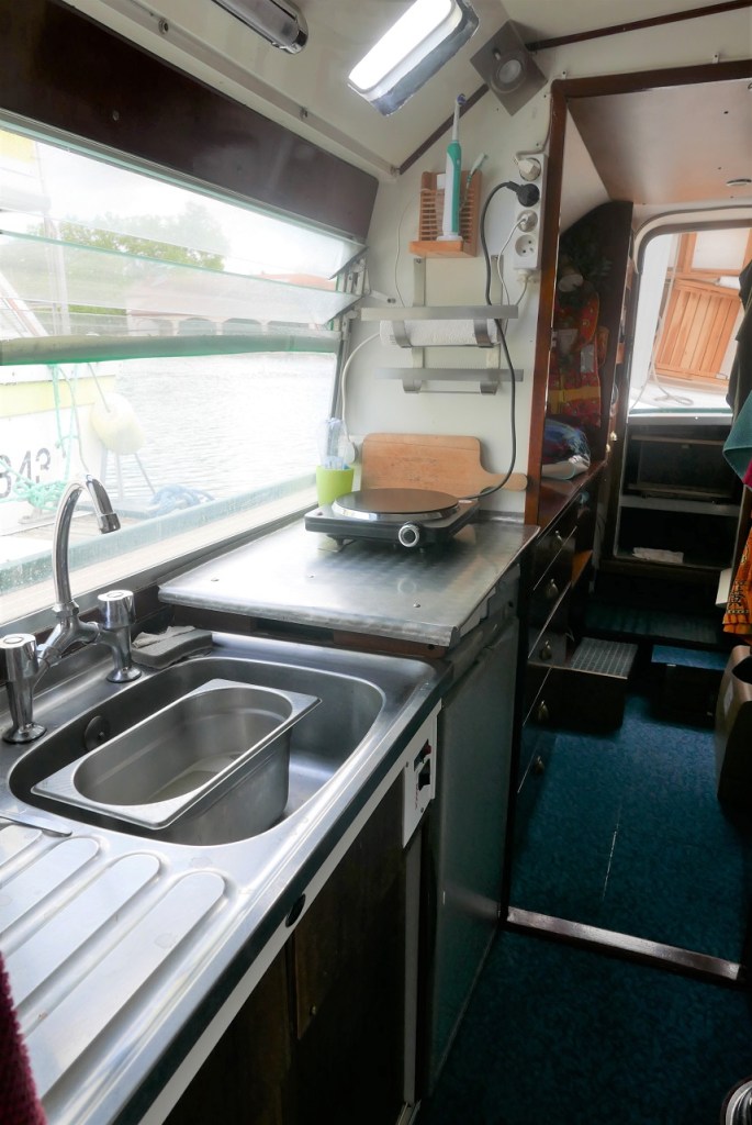Cuisine équipée / Equipped kitchen: Four a gaz avec gazinière 4 feux, micro onde , 2 frigo/freezer Waeco, hauteur sous barrot 1.81m