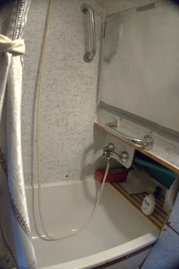 Cabine 2 / Room: Lit double 160×200,1 salle d’eau, évier WC électrique douche, hauteur sous barrot 1.81 m