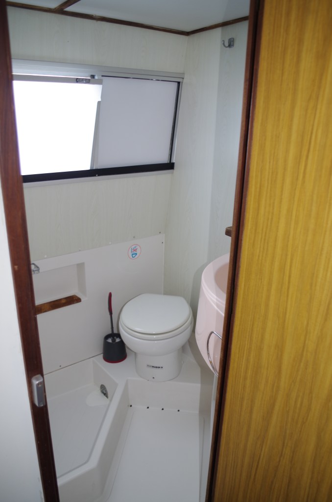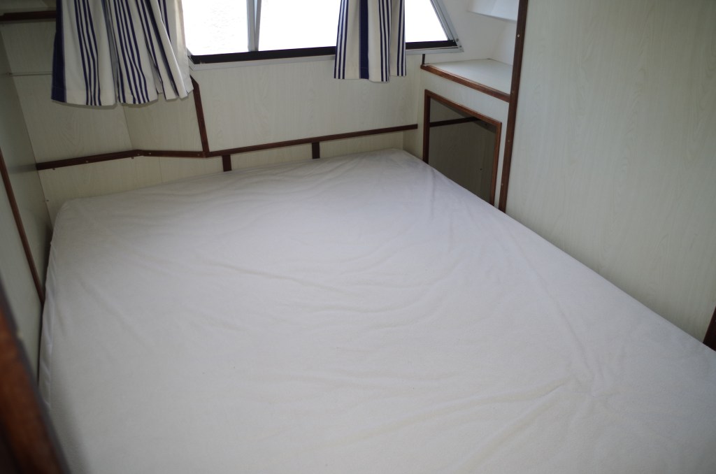 Cabine 1 / Room : Lit double 160×200, 1 salle d’eau, évier WC électrique douche, hauteur sous barrot 1.81 m