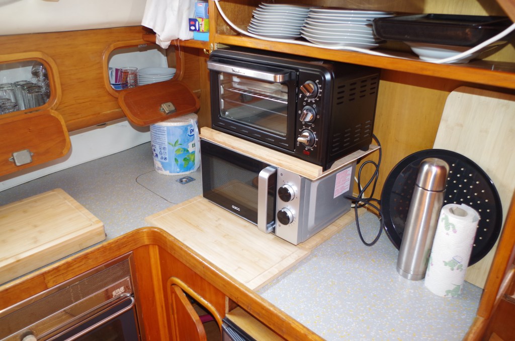 Cuisine équipée / Equipped kitchen: Four a gaz avec gazinière 4 feux, micro onde , 1 frigo, 2 mini congélateurs Listo, hauteur sous barrot 2m